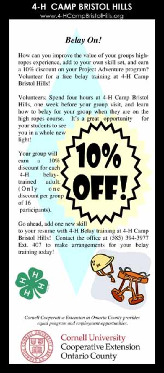 How can you improve the value of your groups high ropes experience, add to your own skill set, and earn a 10% discount on your Project Adventure program? Volunteer for a free belay training at 4-H Camp Bristol Hills! Volunteers; Spend four hours at 4-H Camp Bristol Hills, one week before your group visit, and learn how to belay for your group when they are on the high ropes course. It’s a great opportunity for your students to see you in a whole new light! Your group will earn a 10% discount for each 4-H belay trained adult (Only one discount per group of 16 participants). Go ahead, add one new skill to your resume with 4-H Belay training at 4-H Camp Bristol Hills! Contact the office at (585) 394-3977 Ext. 407 to make arrangements for your belay training today!
